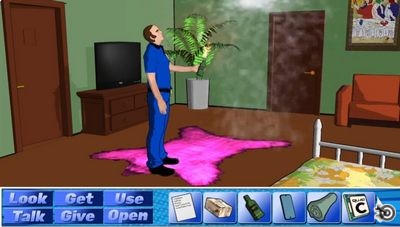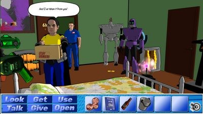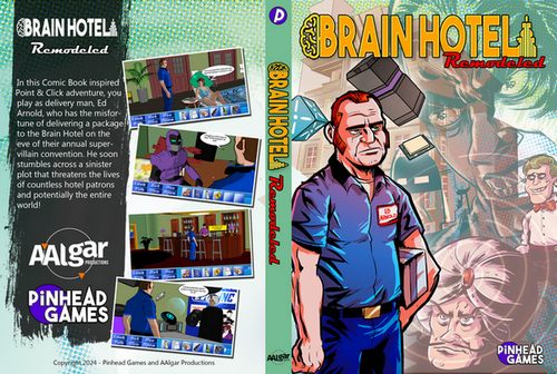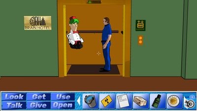 Nuestro nombre es Ed Arnold, somos transportista, tenemos nuestra propia empresa, la “Stuff Bringers”, y vivimos en un mundo lleno de superhéroes. Tras las animaciones de presentación en “plan cómic”, miramos el paquete que ya tenemos en el inventario. De la fuente cogemos unas monedas y entramos en el “Brain Hotel”. Hablamos con el recepcionista de la tercera frase dos veces y miramos el folleto sobre la mesa.