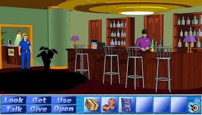 Sobre la mesa cogemos el chip y volvemos al bar. En el inventario combinamos la tarjeta de radioactidad con la llave de la 618, se la damos al barman y nos da la botella verde de plutonio.