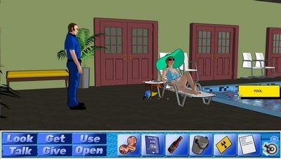 Vamos al ascensor y le pedimos a Impo que nos lleve a la piscina. Le damos la toalla a la mujer y nos da una moneda. Usamos el cubo en la piscina para llenarlo de agua. Ascensor a la planta baja, bebemos la botella de “Choco-Kale” e invitamos a Impo a beber, con lo que nos enseña un móvil, pero no nos lo da.