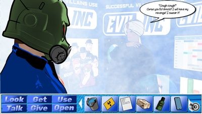 Hablamos con el clon barman de todo y nos da un refresco de “Choco-Kale”. Miramos las botellas y seguimos a la derecha, donde cogemos el cubo y miramos los cuadros y la máquina expendedora. Al final hablamos con el “mago mental” de todo y nos hace una demostración. Cogemos la máscara de gas y al intentar ir a la izquierda nos la hace devolver.