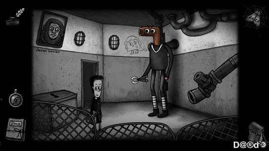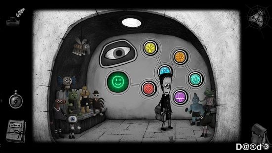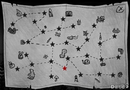 Ahora, para recordar, con el mapa vamos a la cara cuadrada con nariz larga (centre izquierda) y nos fijamos en los posters. Mapa y a la habitación del calamar para mirar los gráficos. Mapa a la estrella inferior del pie peludo y cogemos la píldora (11/14), que damos al escarabajo del diario.