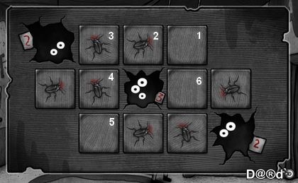Mapa y vamos al bicho cónico con una redonda en la cabeza (centro derecho), donde está el pulpo. Le damos la manzana y cogemos el escarabajo. Derecha a la habitación de una especie de persona/rana, miramos el cuadro apartando los bichos (7/12) y hacemos el puzle de la trampilla del suelo.
