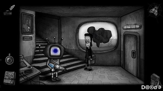 Miramos el televisor, damos el gusano al bicho y cogemos la palanca. Salimos e izquierda al salón de un “bicho/pera”, donde miramos el cuadro (10/12).