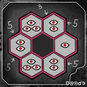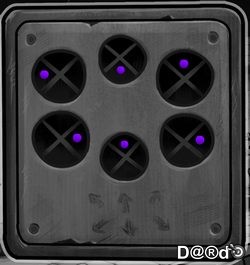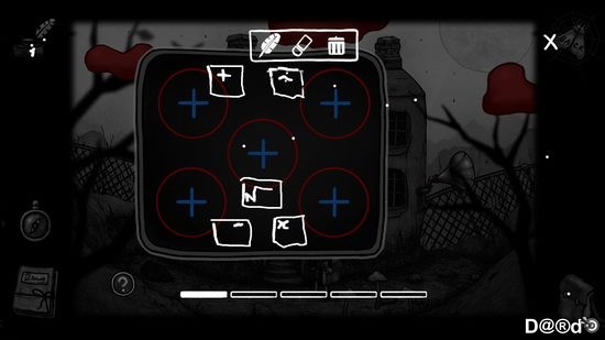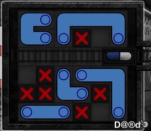 Cogemos la barricada. Miramos la mano y vemos un puzle. Mapa al calamar y anotamos el orden de sus movimientos al mirar las flechas de los lados. Volvemos al pasillo de la mano abierta, abrimos otra vez el puzle y lo dejamos así: