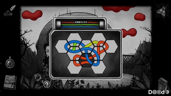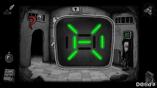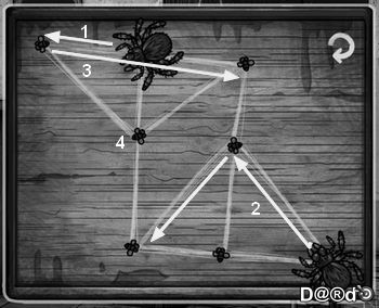 Pulsamos en la araña para que suba y al volver deja caer una píldora (8/14), que cogemos y la usamos en el escarabajo del diario. Miramos la caja de la derecha y hacemos el puzle para que coincidan las dos arañas en el centro. (Hay muchas formas para que se pillen entre ellas).