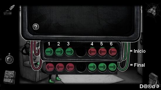Cogemos las tijeras y subimos otro piso. Vamos a la derecha, pero en el centro cogemos el cuchillo. Pasamos otra especie de vestíbulo y hablamos con el bicho que se balancea. Miramos el mueble y pulsamos en el escarabajo. Irán apareciendo más escarabajos y los pulsamos por orden.