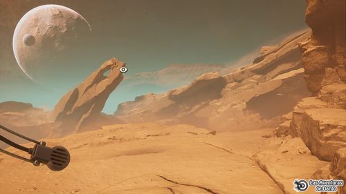 Vamos en dirección a la luna y cuando desaparece vamos a la izquierda y adelante frente a una roca en punta. Desde aquí vamos por el camino de más a la derecha y llegamos al cuerpo, que cogemos. Retrocedemos el camino hasta el módulo, decimos 3-1-3, entramos y lo sentamos. Salimos, vamos justo por detrás del módulo, al fondo vemos una bandera y vamos hacia ella saltando la bajada. Pulsamos en la sonda, abrimos la compuerta, giramos su interior y se abre.