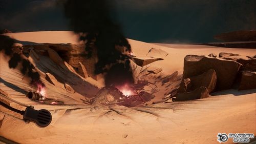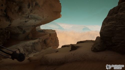 Seguimos por el borde del camino del otro lado hasta pasar entre las rocas y llegamos frente a una luna. Pulsamos el telemetro (Z), hacemos “zoom” y justo delante vemos el campamento. Seguimos por la izquierda, bajamos la pendiente y todo adelante en dirección a la luna. Nos refugiamos en la roca que tenemos delante y esperamos que pare la tormenta de arena. A la izquierda de la luna vemos el campamento, elegimos la primera frase y vamos hacia allá pasando entre la niebla.