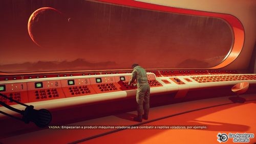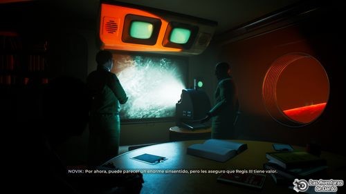 Subimos por un paso de rocas, damos media vuelta y miramos el satélite. De nuevo tenemos otra visión de la nave donde estamos en la sala de reuniones con los demás, miramos el documento de la mesa frente a nosotros y vamos pasando las páginas adelante y atrás mientras los demás hablan hasta que se apaga la luz y vemos una proyección.