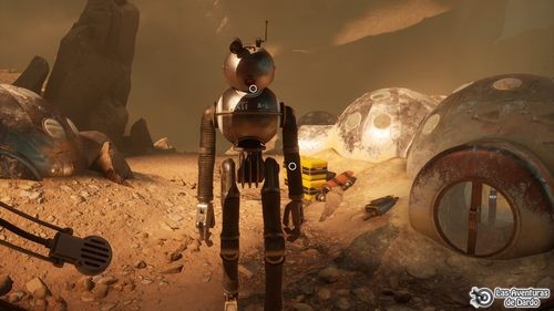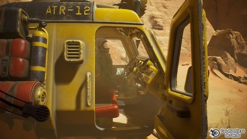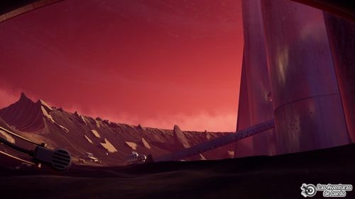 Bajando a la derecha tenemos al robot (Arti) destrozado y le hablamos. Decimos las frases 2-1. Volvemos al rover, ahora estamos en una cueva, vamos adelante, frase 2 y salimos por la izquierda. Seguimos por el camino hasta llegar a una especie de grúa, salimos del vehículo, miramos el objeto volador, usamos el telemetro para hacer “zoom” a unos transportadores y a otro “antimat”, vemos pasar una silueta humana y decimos 2.