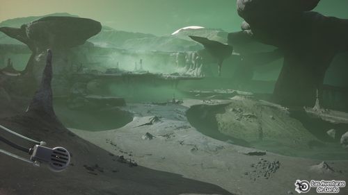 Miramos la parte superior izquierda y vemos que estamos en el planeta Regis III, del que no sabemos nada. Luego vamos mirando los siguientes puntos hasta leerlo todo. Al final debemos decidir cuál es nuestra ubicación, elegimos cualquiera de los tres puntos del diario, quedamos frente a las rocas y usamos los prismáticos (“telemetro”) en la roca para pulsar en todos los objetos que encontremos.