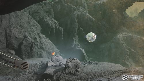 Vamos hasta el rover (“astromóvil”). Lo miramos y también el tanque de oxígeno la parte trasera. Frase 2, abrimos la puerta y entramos. Nos ponemos frente al volante y lo ponemos en marcha (apretar botón rojo con botón izquierdo ratón y “D” pulsados). Frases 1-1, vamos adelante primero girando siempre a la izquierda hasta dejarnos caer y luego ya todo adelante pasando por un túnel redondo. Izquierda y adelante y al final, a los lados, encontramos una salida.
