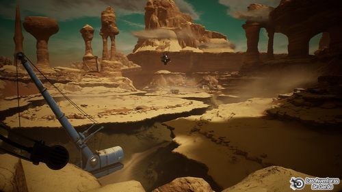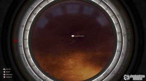 Vamos a mirar el vehículo de detrás, frases 2-2, media vuelta y bajamos por el camino de rocas del otro lado hasta el vehículo, en el que entramos. Bajamos hasta quedar frente a dos vehículos y cogemos la pista de la derecha hasta llegar frente a los aparatos (el globo colgado) que vimos con el “zoom” del telemetro. Bajamos, vamos al panel del aparato del suelo (la base del globo), giramos la manivela, pulsamos el botón, cogemos las tablet y lo vamos mirando todo varias veces.