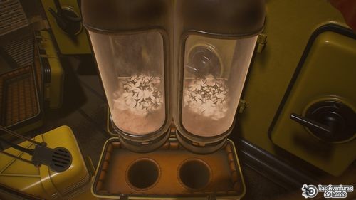 En el panel del fondo rojo giramos la rueda inferior central, bajamos la palanca y pasamos la puerta. Salimos, miramos el guante y pasamos al exterior. Regresamos al aparato volador, subimos por una de sus “patas”, entramos, pulsamos los dos paneles de la puerta y pasamos a una especie de almacén de contenedores amarillos. Frase 2, miramos una de las cajas del suelo, la abrimos, frases 1-2 y levantamos los dos tubos que contiene.