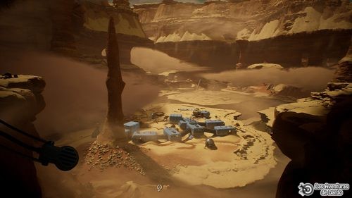 A su derecha miramos el mapa y todos sus puntos. Subimos al nivel superior, vamos hasta las tres palancas, bajamos la central y vemos como hemos activado una cúpula de fuerza. Bajamos, miramos el panel de la izquierda, pulsamos los indicadores y lo dejamos. Salimos y regresamos al rover. Conducimos hasta el vehículo del fondo con antena en el techo y justo detrás suyo giramos a la izquierda y bajamos a lo que parece un lago seco con un armatroste en el centro.
