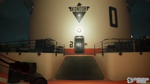 Miramos el robot “ciclope” que baja, frase 2, subimos por la rampa y frases 1-3. Entramos en la súper nave Kondor pasando la puerta del fondo a la derecha. Vamos todo adelante a la puerta 2 (es un ascensor) y pulsamos el botón.