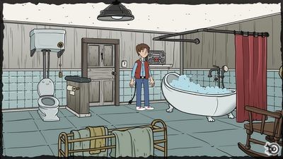 Cerramos la puerta, vamos a la derecha hasta la valla y cogemos una ramita de muérdago. Volvemos a entrar en la casa, a un amplio salón, cogemos la cuerda de la cortina izquierda y luego la cortina entera. De la chimenea cogemos el caldero y de su derecha uno de los platos decorativos colgados (el de la derecha). Subimos el primer tramo de escalera y cogemos otro plato decorativo. Vamos al primer piso y entramos por la puerta derecha a un baño.