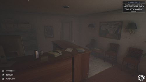 Somos el oficial de policía Iker Carmena y llegamos a un motel de carretera, el Holiday, para descansar del viaje. Vamos a la izquierda para entrar en la oficina y hablamos con Marcos Bueno, el encargado, para coger una habitación, con lo que nos da la llave de la 18. Salimos, adelante, subimos la escalera, izquierda y entramos en la habitación 18 pulsando la puerta. Pulsamos en la mesa para dejar nuestras cosas, cerramos la puerta y pulsamos en la cama para dormir.