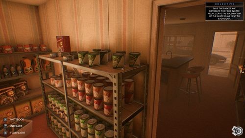 Cogemos la caja de plástico del fondo, en el suelo, llena de latas. Vamos frente a la habitación 02, pulsamos en la silla y dejamos unas latas. Hacemos lo mismo en las habitaciones 04 y 07. Subimos al primer piso y hacemos lo mismo en las habitaciones 11 y 15. Volvemos a nuestra habitación.