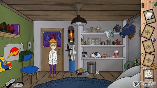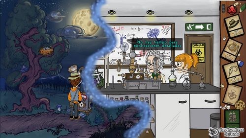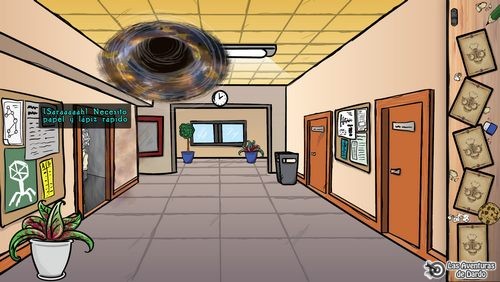 Empezamos en el laboratorio de la Universidad, donde Sarah, la ayudante de catedra del profesor, ayuda a este, Manny, con un experimento. En el inventario ya tenemos un pañuelo. Abrimos la caja de madera, cogemos el destornillador e intentamos dárselo al profesor, pero no lo quiere. Volvemos a la caja, cogemos el martillo (dejando el destornillador), se lo damos al profesor y tampoco lo quiere.