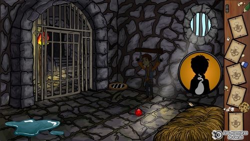 Vamos allá y cogemos unas hojas. (Si queréis podéis volver a mirarlo todo e intentar coger cosas). Nos ponemos el sombrero y hablamos con el guardia. Nos ponemos la pluma y volvemos a hablarle para regresar a la celda. Nos ponemos el sombrero y cogemos algo de paja. Usamos la navaja en la madera de las cadenas y medio la quitamos, pero aún sigue colgada. Nos ponemos la lente, miramos la madera, usamos la “mano” en la paja del inventario y conseguimos un ovillo. Miramos la antorcha.