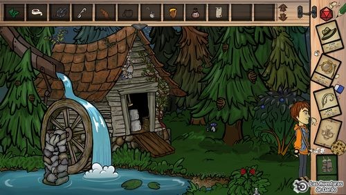 Ahora en el inventario vertical tenemos la segunda casilla con la capa (sigilo, percepción). En el inventario normal tenemos un montón de objetos (nueve), que podemos leer en el cuaderno para que sirven. También del cuaderno leemos el apartado “Anexo”. Nos calamos la capa y vamos al molino. Aquí debemos leer el cuaderno otra vez, todo, hasta que el búho sale volando y lo seguimos al bosque. (Sobre todo leer lo de las “Paradojas temporales” y “Personas conocidas: el pastor”). stamos en lo que será nuestro campamento, lo miramos todo y cogemos un leño del montón.