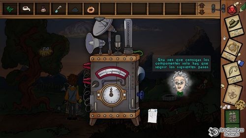- En la parte superior del menú vertical de la derecha tenemos una libreta, la abrimos y lo leemos todo. En ésta altura, no hace falta leer nada, con abrirlo y salir avanzamos. Luego del viaje temporal sí hay que ir leyendo.