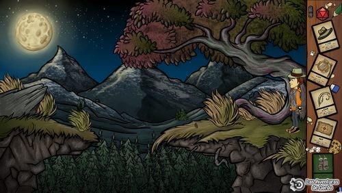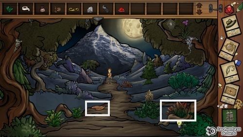 Miramos la flor, nos ponemos el sombrero y seguimos al fondo a un bosque. Nos ponemos la lente y leemos el cartel. Ahora tendremos varios caminos a seguir, pero es un laberinto totalmente aleatorio. Son como siete u ocho pantallas en las que vamos a salir sin tener ni idea de dónde vamos a parar. Siempre serán las mismas, pero la siguiente puede ser cualquiera. Primero debemos dar vueltas hasta encontrar una pantalla con una montaña y la luna al fondo y una mata de hierbas abajo a la derecha. Del centro del camino cogemos el material marrón del suelo.