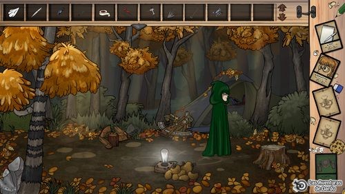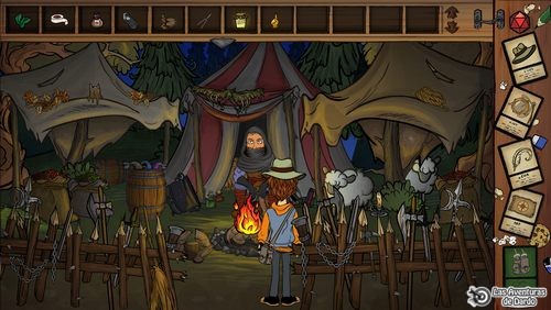 Nos ponemos el sombrero, vamos a cualquier lugar del mapa, volvemos aquí y vemos que el trofeo ya no está y del suelo cogemos unos excrementos. Volvemos a apagar las velas, vamos al tótem y le damos el polvo rojo a Karl. También le damos los excrementos y nos da una “mano dorada”. Volvemos a la habitación del castillo, apagamos las velas, cerramos el cajón, vamos a cualquier lugar, volvemos y nuestra trampa ha surtido efecto. De nuevo apagamos las velas. Mapa al bosque (puente), entramos y seguimos las huellas blancas, que nos pasearán por todo el bosque aleatoriamente hasta llegar a un campamento.
