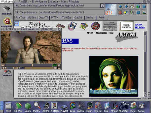 Lo primero que llama la atención es la barra de tareas visual, en concreto aquellos programas que uno no tenia... asi que le doy al ACTION para sorprenderme si en verdad hay buena optimizacion con mi procesador ciertamente anticuado. Se abre una ventana de seleccion, y meto el CD de AmigaOS 3.9 para acceder al cajón Videos. ¡¡alguno habra preparado para mi velocidad de proceso!! Elijo el mas pequeño de todos los que hay (uno de 9 megas de Jurassic Park... una de sus secuelas para el 2001), y veo como carga un MooVid (que es el ACTION) en ventana, aparentemente reproduciendolo en tamaño normal (es pequeño el video) a 25 imagenes por segundo (fps). No contento con ello aunque ciertamente no es el mejor, elijo otro de 17 Mb de Final Fantasy... este es un poco mayor en ventana.. aquí ha bajado la velocidad y el contador esta situado a 20, le doy al play del interface del ACTION y veo como el trailer va bastante fluido, incluso moviendo el raton a lo loco no se ralentiza la reproduccion en ventana, moviendo la ventana del reproductor y dejandola en otro lugar, la imagen se actualiza rapidamente en ese lugar. Ciertamente va mejor que las demos que he probado del MooVid. 8-))) Vamos con otra prueba mayor... ¿que pasa si meto videos no preparados especialmente para AmigaOS 3.9? meto unos que he ido sacando de mis conexiones a internet, me gusta el manga así que a probar con uno de ellos. KOR, tengo algunos en QuickTime de mi ultima limpieza de disco duro pasados a CD. Recuerdo que algunos se pasaban de Stereo a Mono y hacia cosas raras con el audio... Lo pongo y descubro que parece ser cosa del Codec, porque hace lo mismo. 8-D.